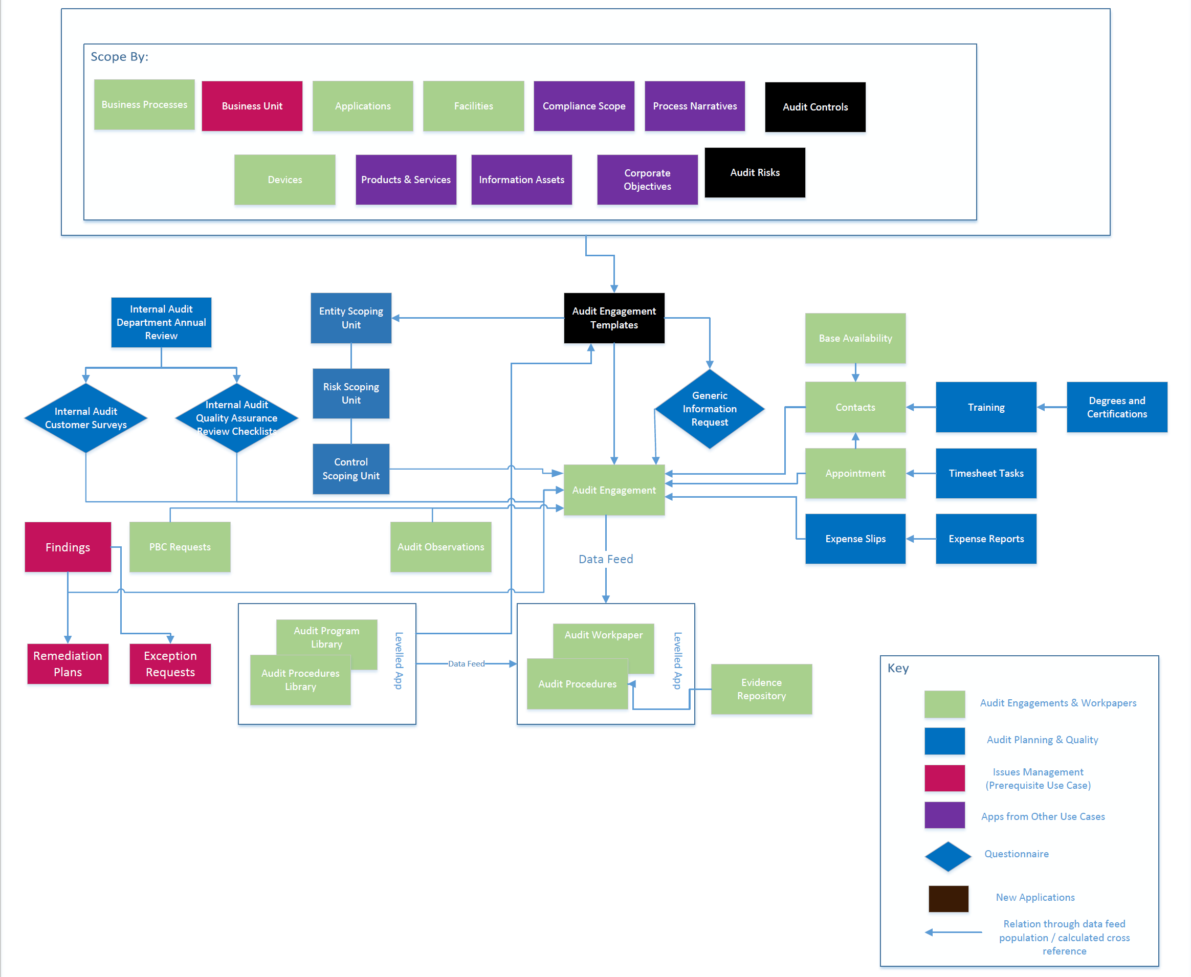 The following diagram shows the relationships between the applications in the Audit Engagements & Workpapers use case.