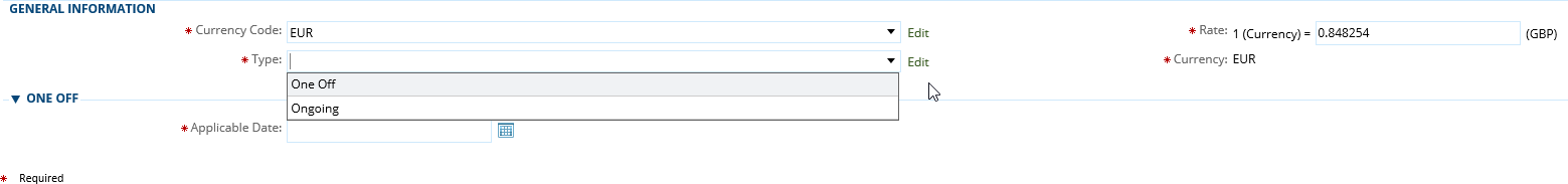 Applicable Date: the date that the exchange rate applies for (only applies to One Off entries)