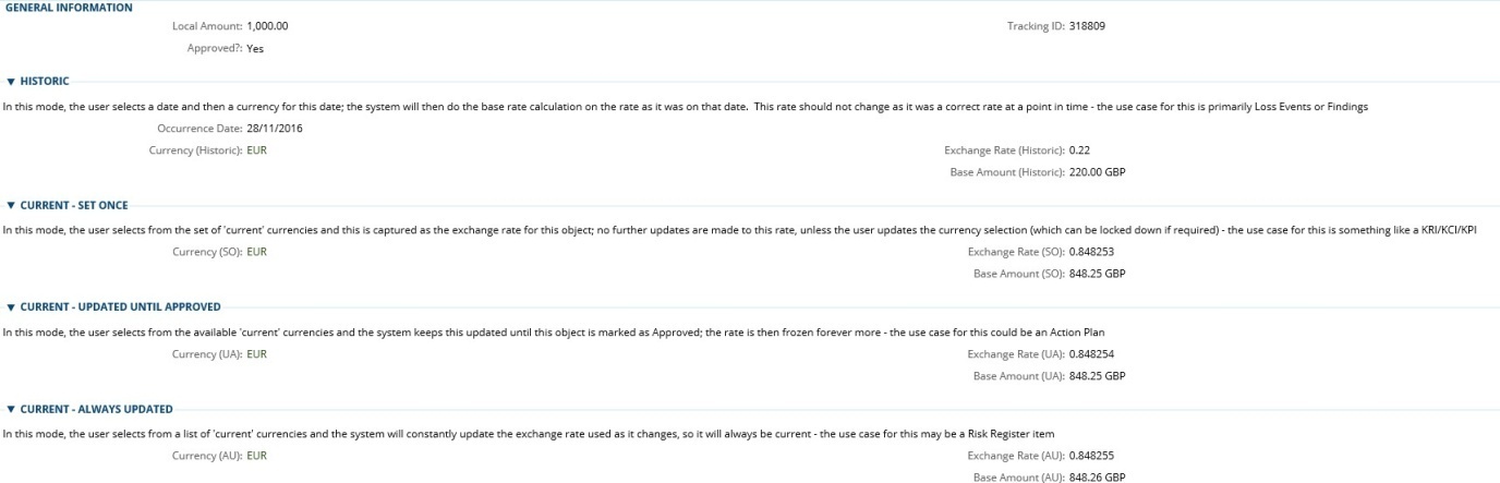 An example use case of this sub-approach is entering a financial impact in the Risk Register – this should always be kept up-to-date with the latest exchange rate so that the true ‘current’ predicted cost is always reported at group level.