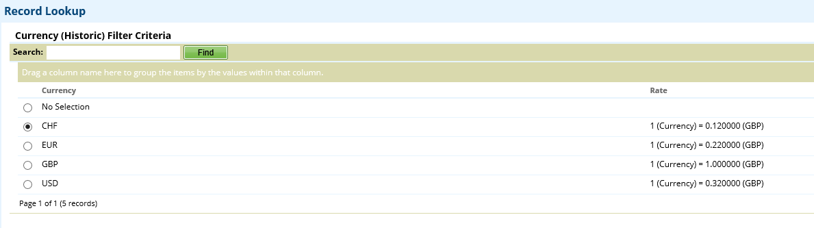 If selecting a ‘historic’ currency rate, the system shouldn’t force the user to manually select the correct currency rate from a list with the applicable dates shown; the user should enter an occurrence date and then the system should show only the currency rates that are applicable.